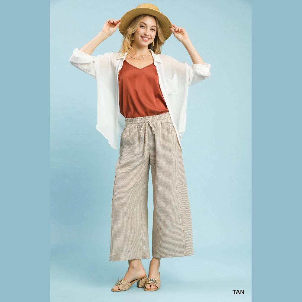 Step into easy, breezy style with the Linen Blend Striped Wide Leg Pants by Umgee. Designed for comfort and movement, these pants blend relaxed elegance with everyday versatility.