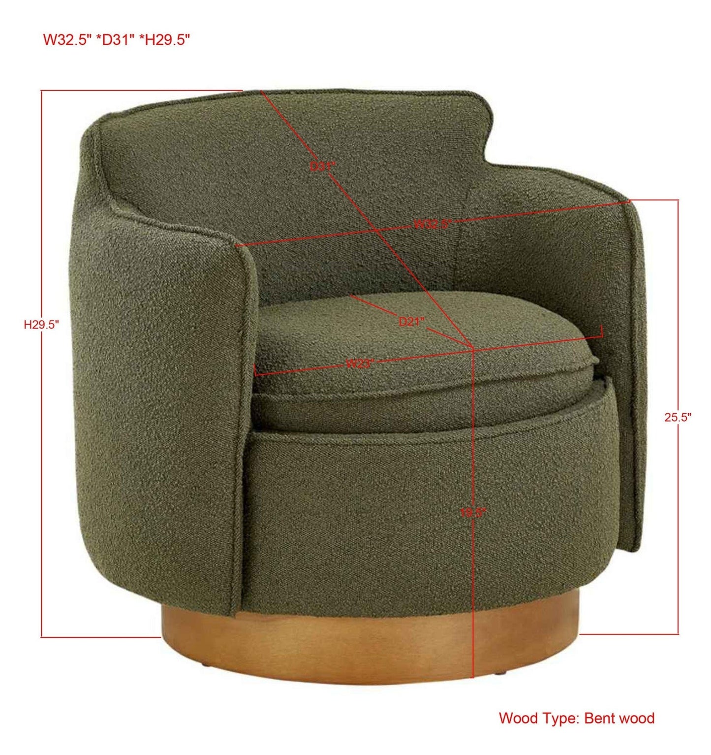 The contemporary silhouette features gently curved arms and a supportive backrest, creating a cozy, hug-like feel. Perched atop a sleek, warm wood-finished swivel base, it provides effortless mobility while exuding timeless elegance. Perfect for reading nooks, lounges, or living rooms, this statement piece combines stylish functionality with exceptional comfort.