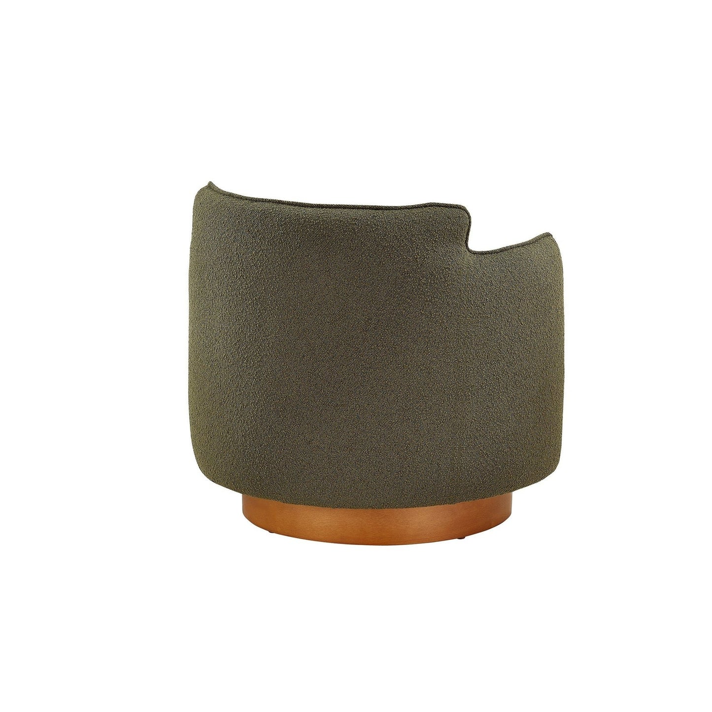 The Luke Swivel Chair is upholstered in luxurious green boucle fabric, offering a rich texture and a subtle pop of color that blends seamlessly with neutral palettes.