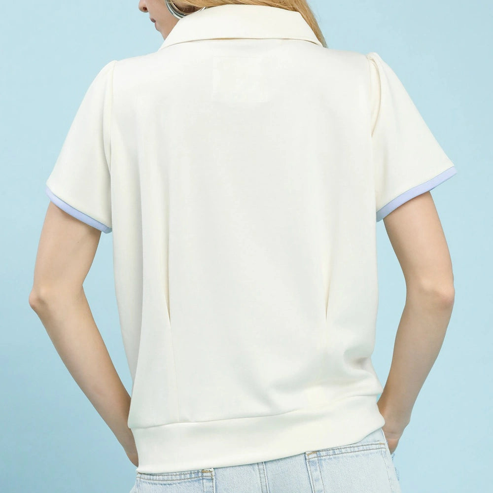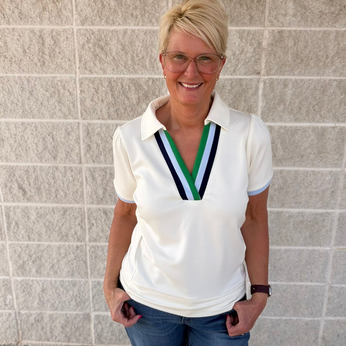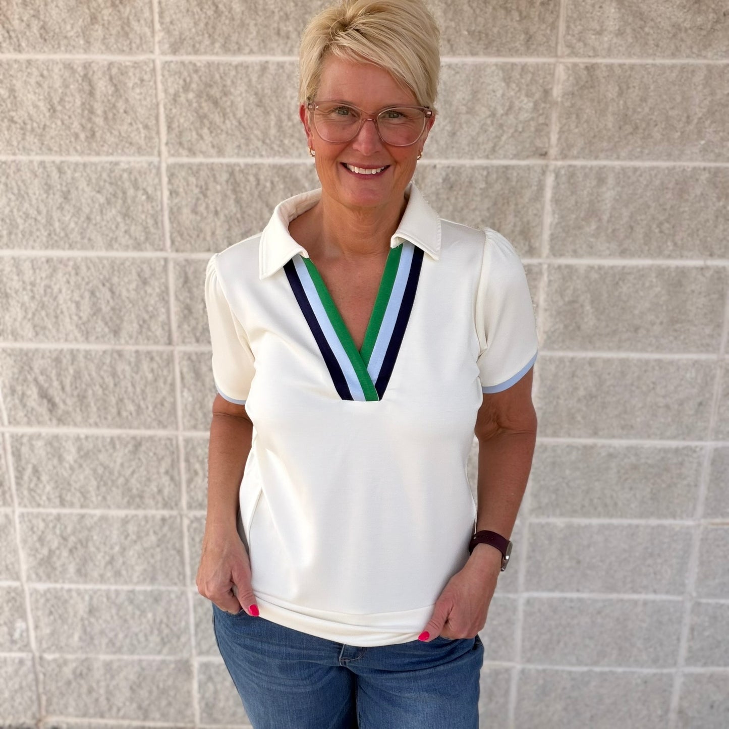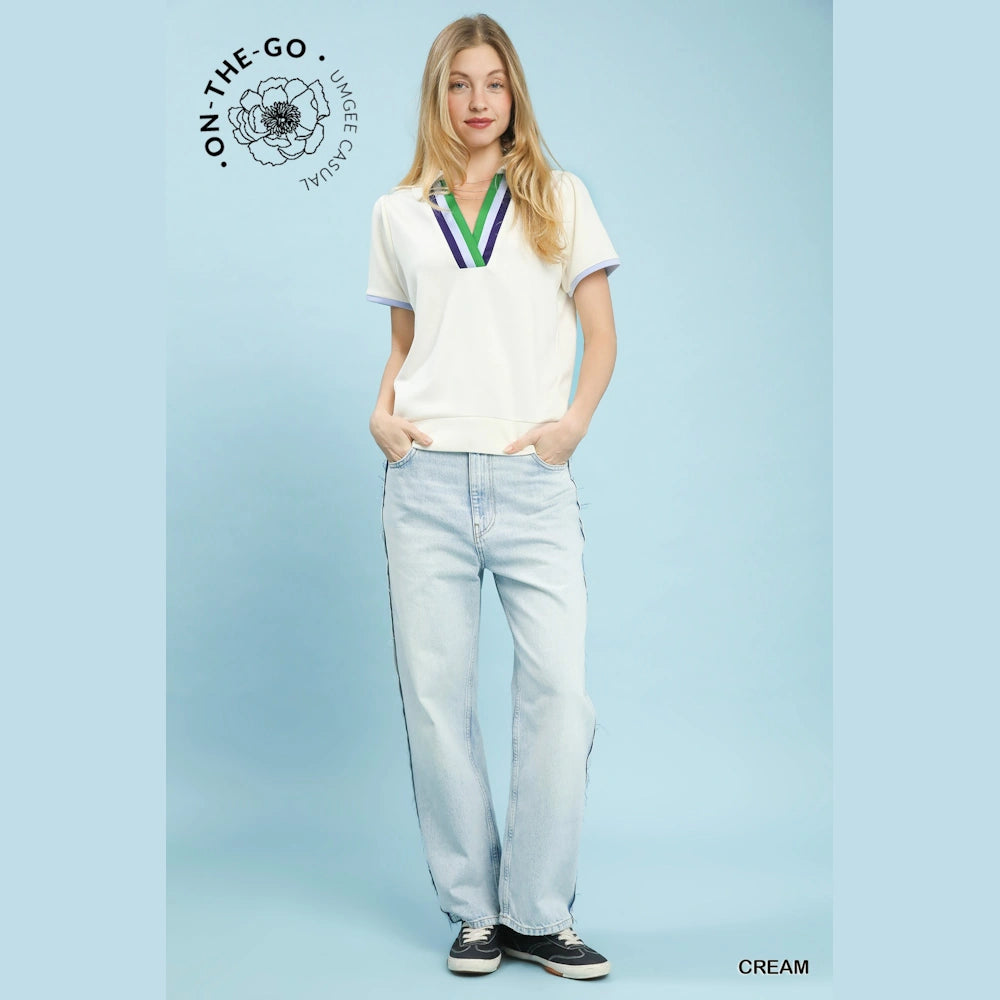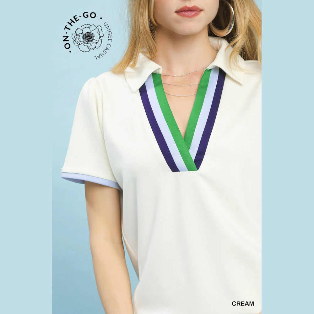 Split V-neckline with contrast trim