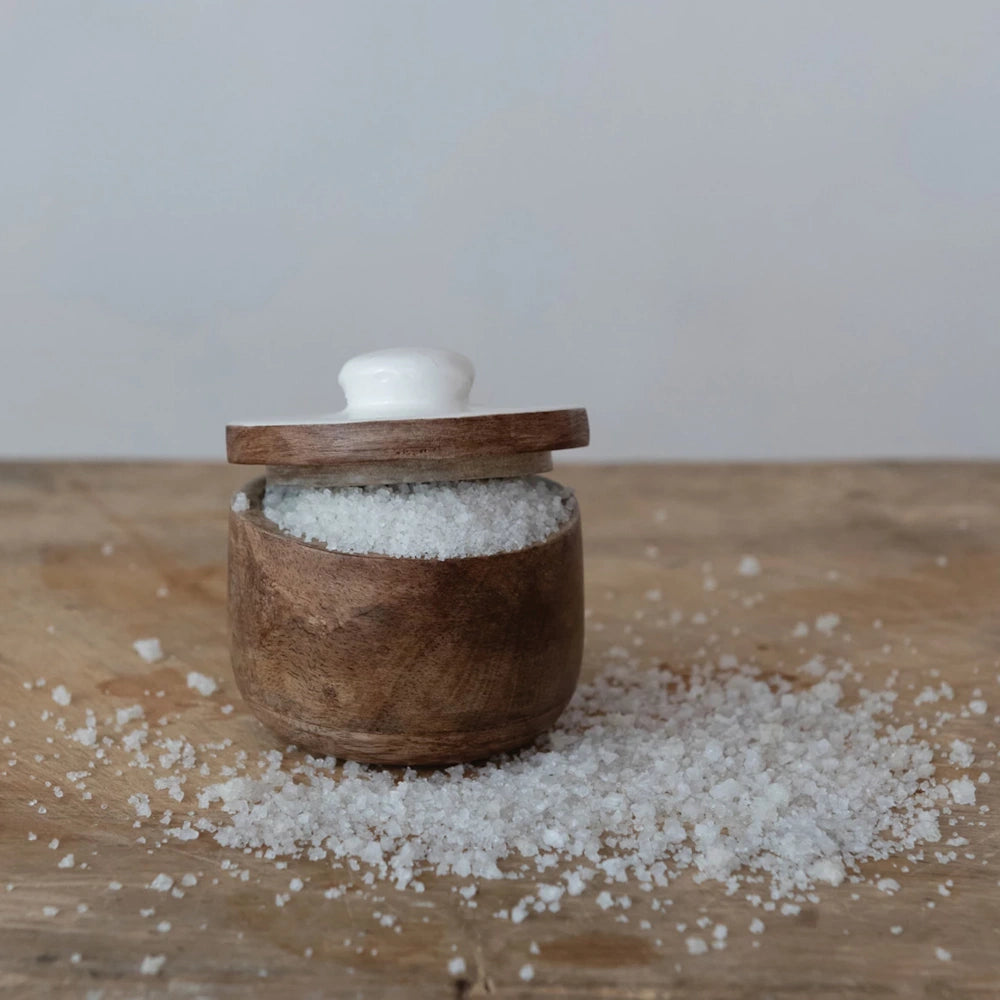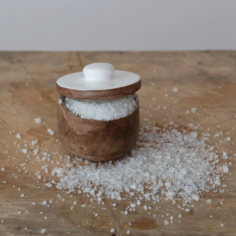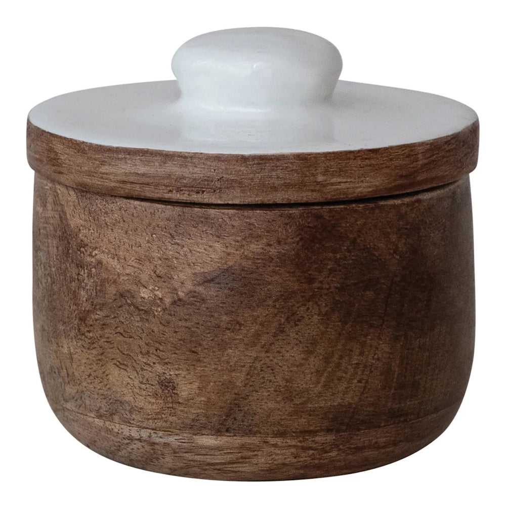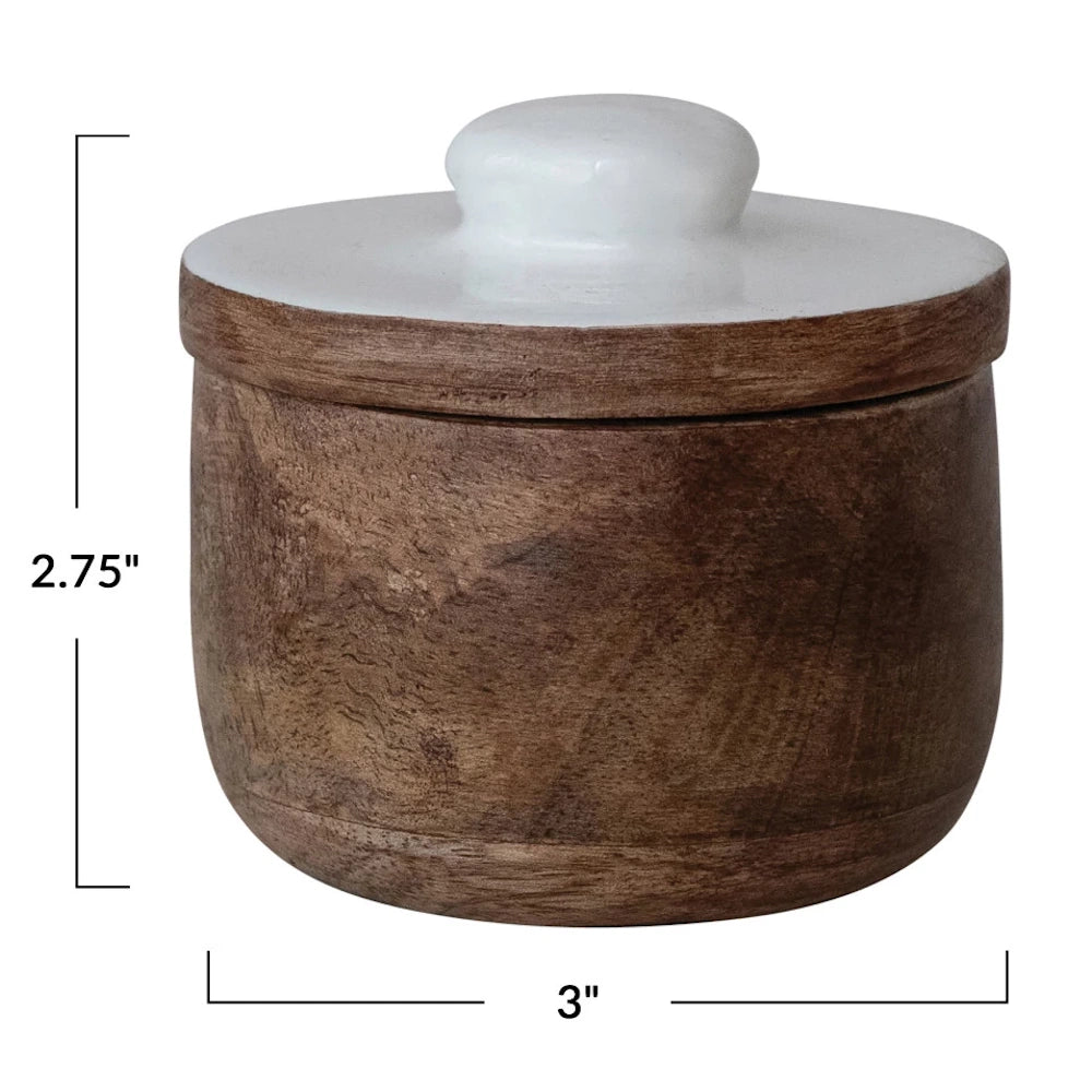 Bring warmth, charm, and everyday convenience to your kitchen with this Mango Wood Pinch Pot with Enameled Lid. Crafted from beautiful natural mango wood and paired with a crisp white enamel top, this stylish little essential keeps your favorite spices, salts, and seasonings close at hand while adding a clean, modern accent to your countertop.