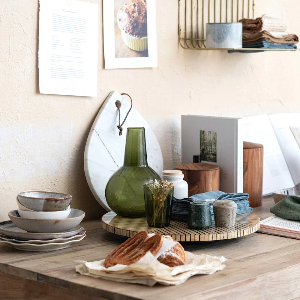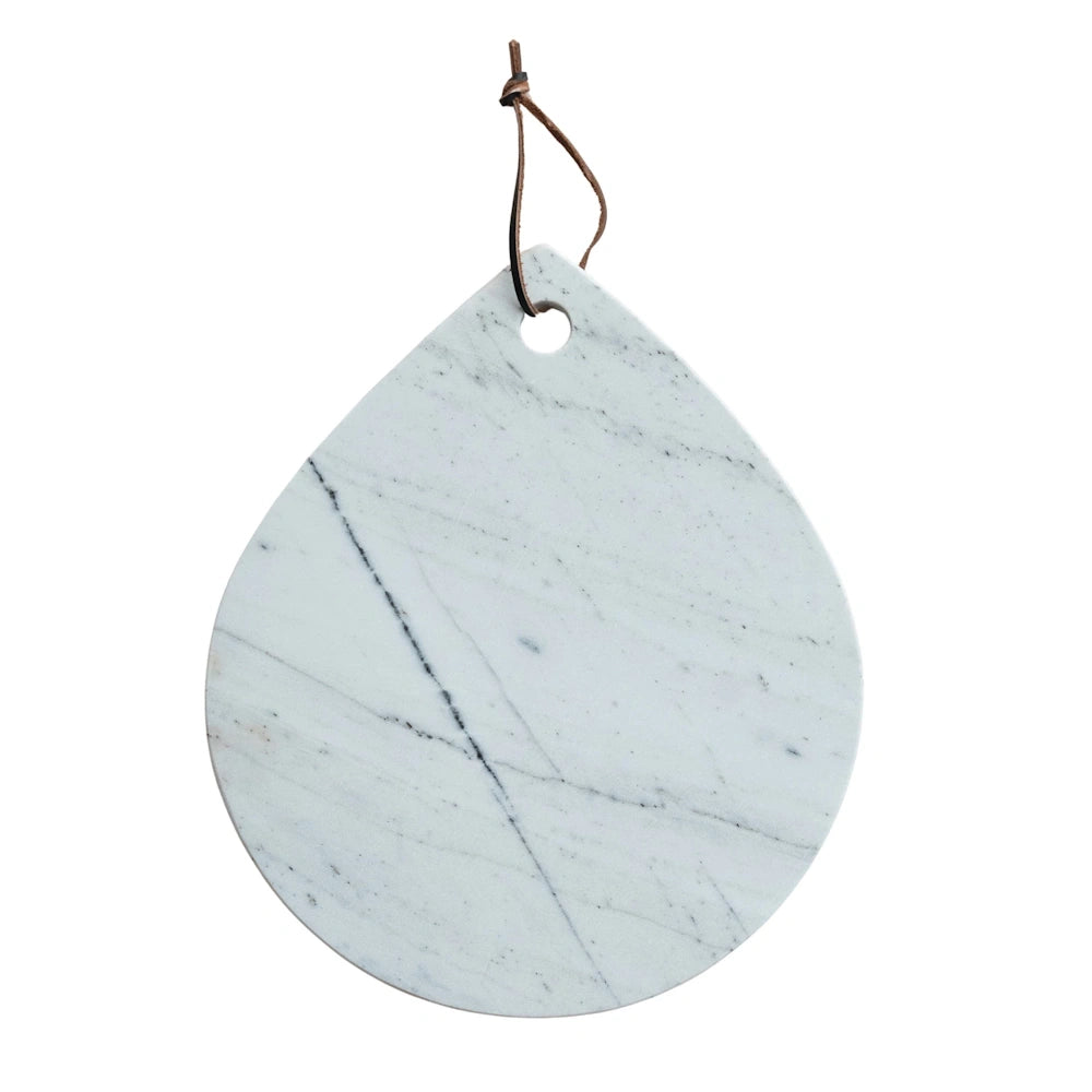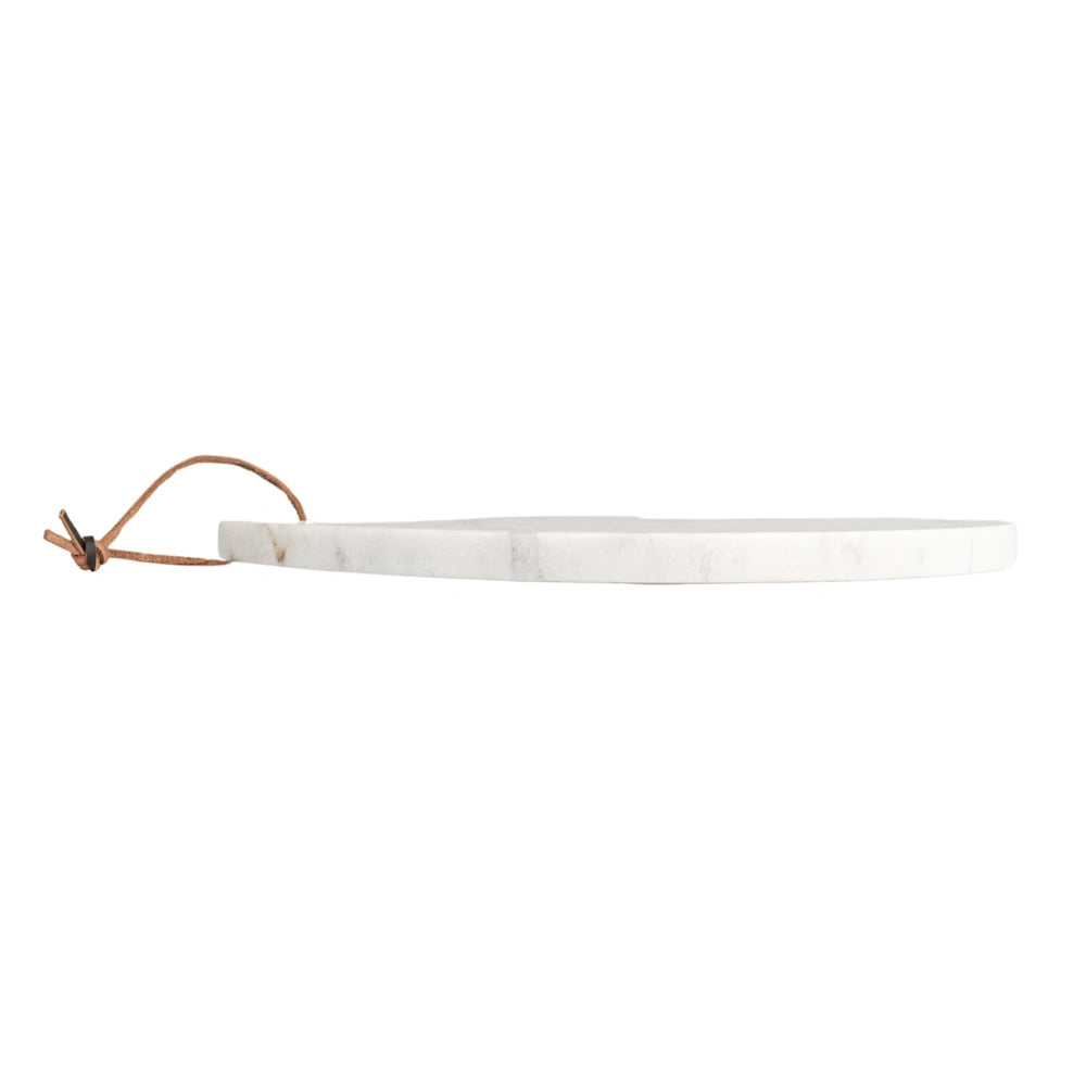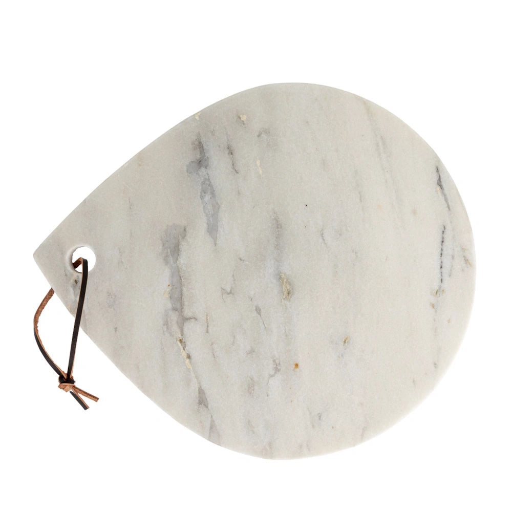 The integrated handle makes serving and styling effortless, while the genuine leather tie adds a warm, organic contrast to the smooth stone. Each board features unique natural veining, ensuring no two pieces are exactly alike. Use it for entertaining, charcuterie spreads, or as a decorative accent when not in use.
