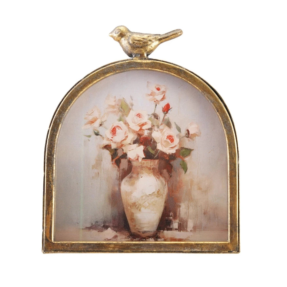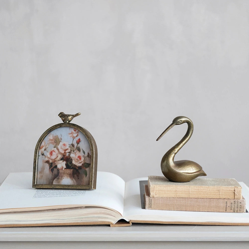 Featuring a graceful arched silhouette and a delicate bird finial, this frame adds vintage charm and sculptural beauty to any space.