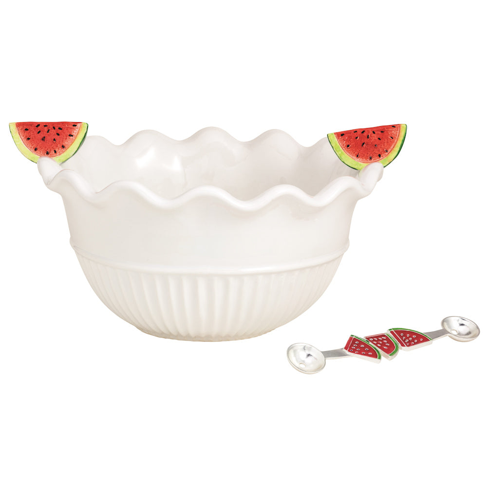 Textured ceramic bowl features ruffle rim with hand-painted ceramic watermelon attachments.