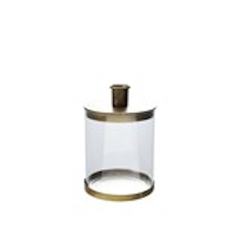 Crafted from sleek metal and clear glass, this versatile piece functions beautifully as both a candle holder and a decorative container.