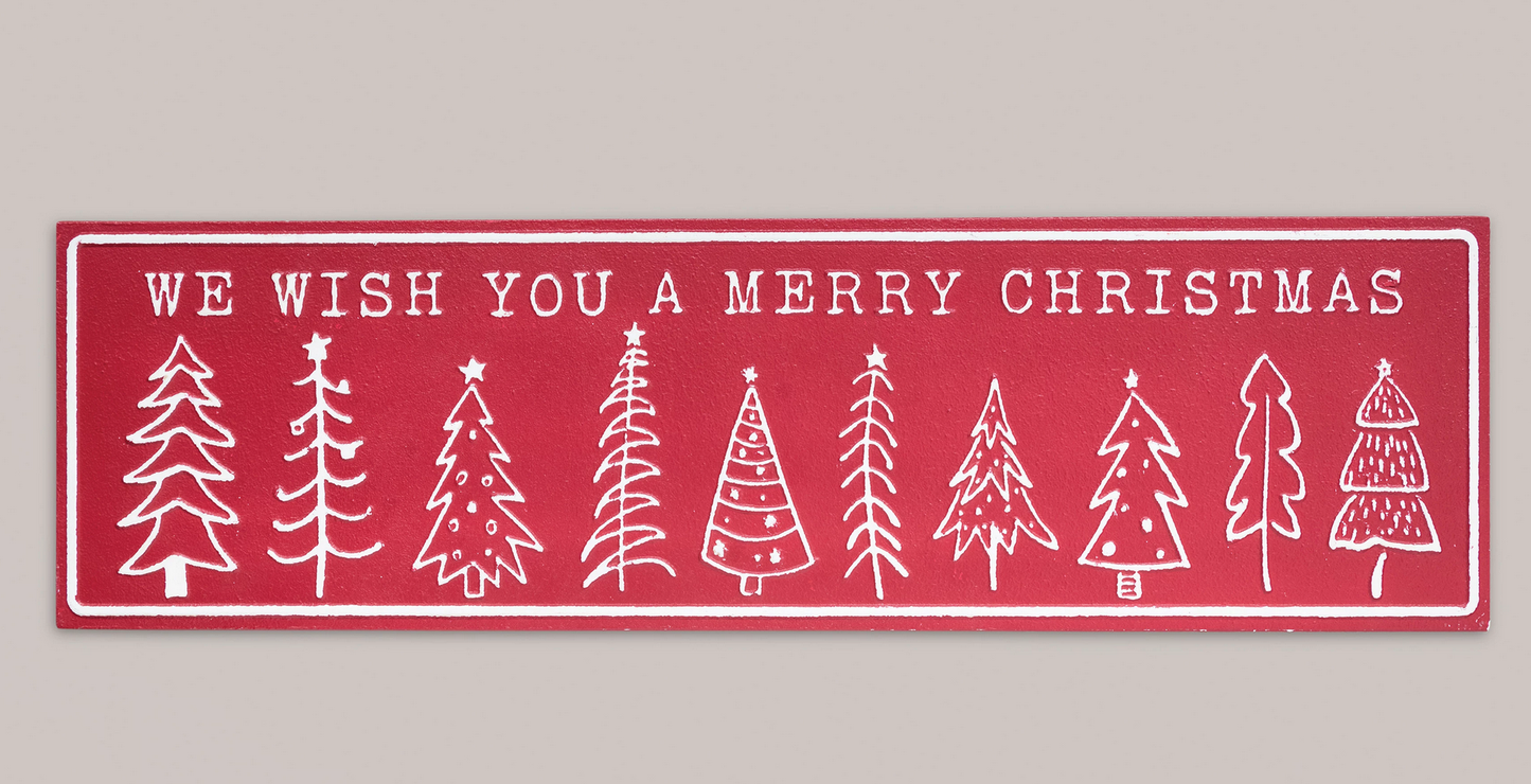 Metal Wall Decor with Christmas Trees "We Wish You...", Distressed Red and White