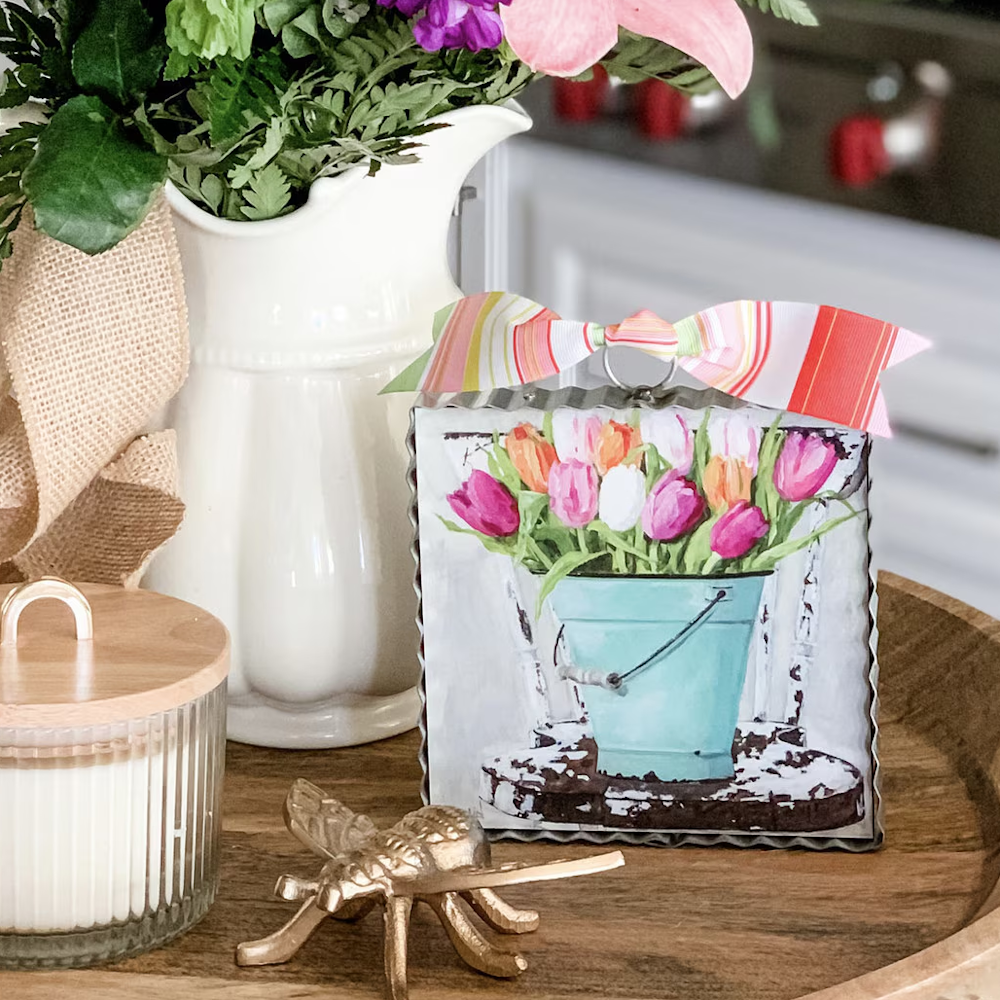 This delightful piece features a colorful arrangement of tulips in a classic bucket, adding vibrant color, texture, and a playful, farmhouse-inspired touch to any space.