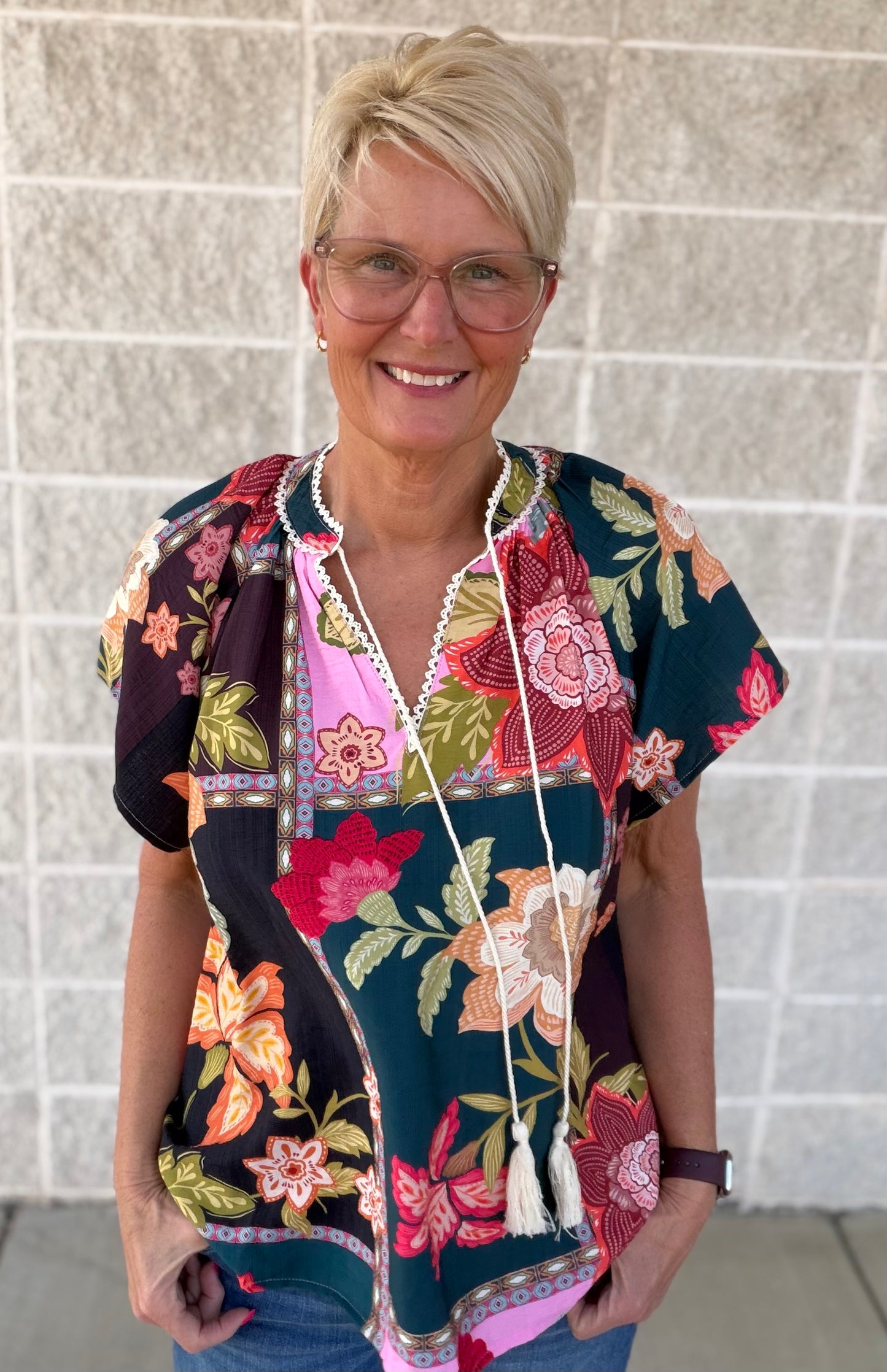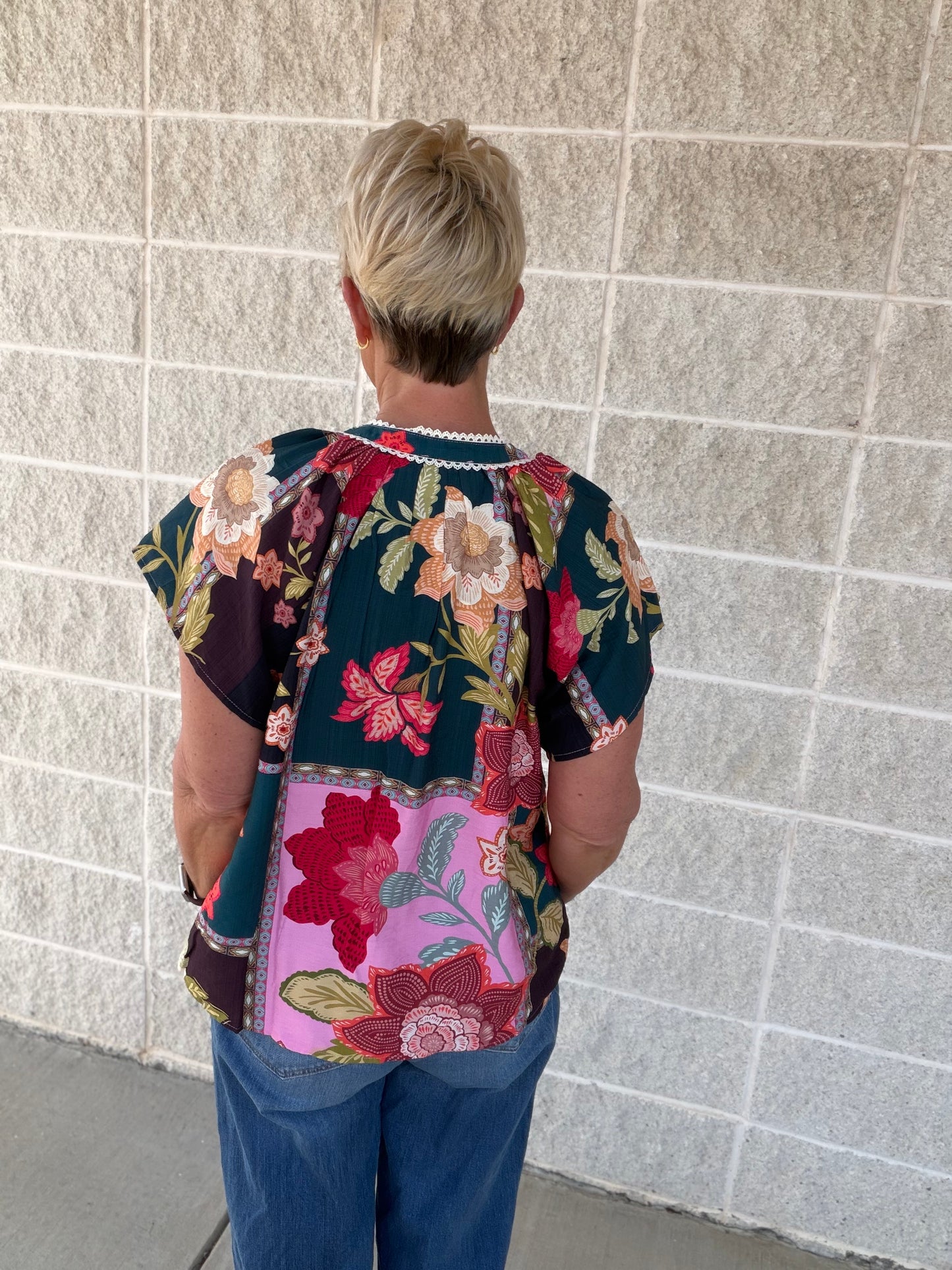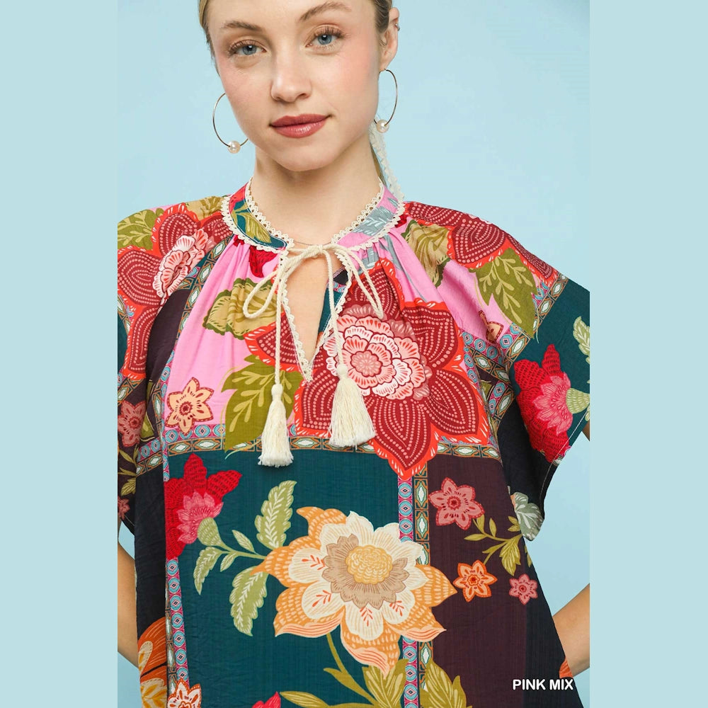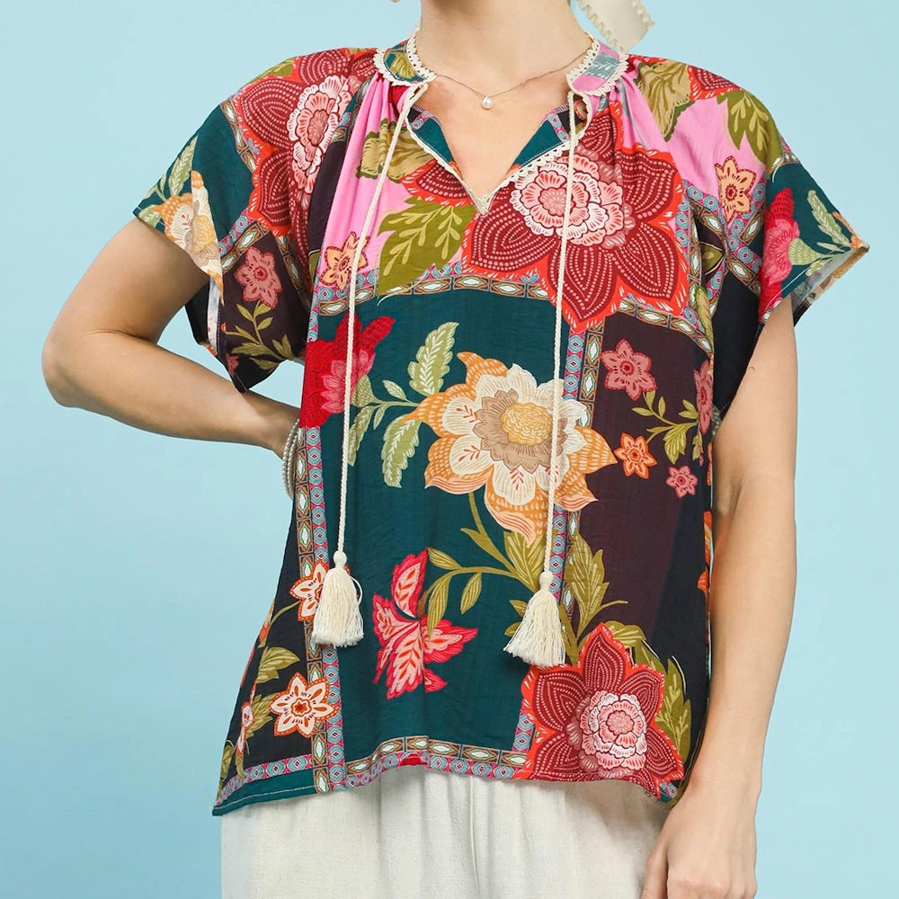 Bring artistic flair to your everyday style with the Mix Floral Patchwork Tassel Tie Top by Umgee. Designed with vibrant patterns and feminine details, this top delivers standout boho charm with easy, all-day comfort.
