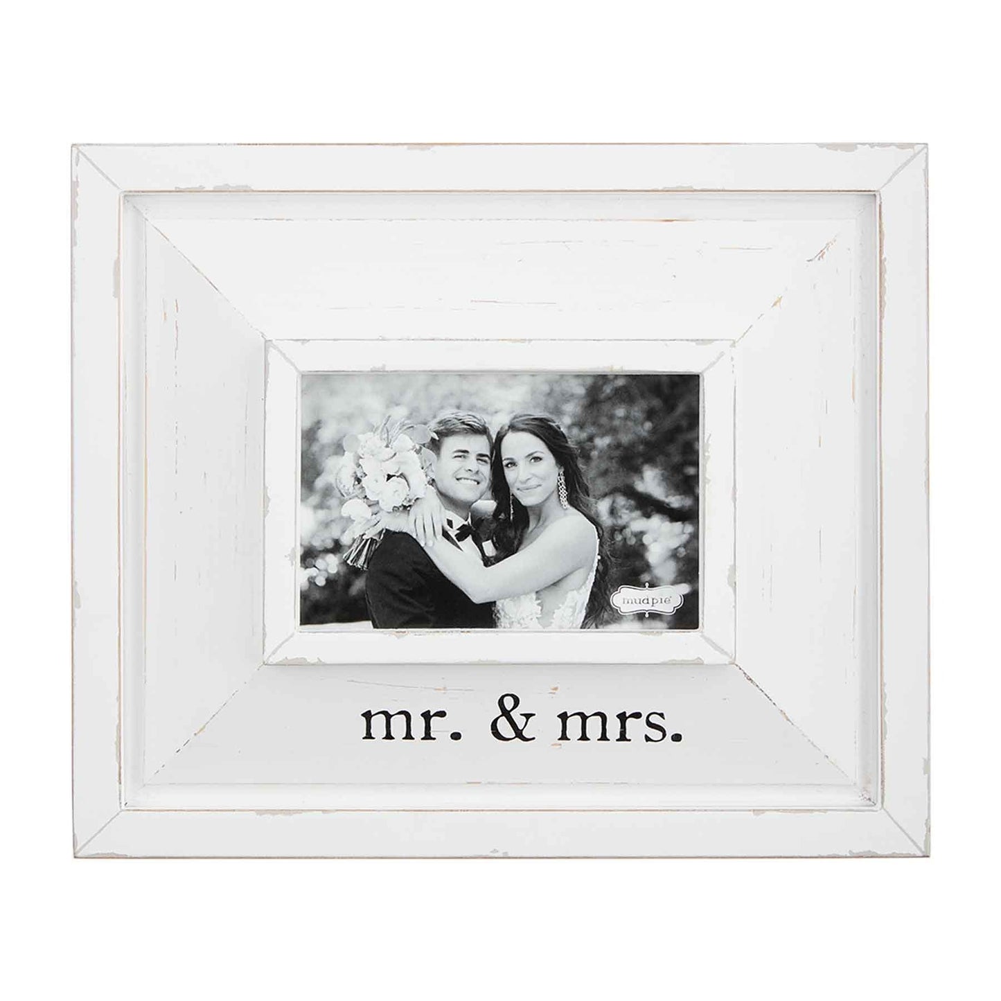 The picture frame holds a 4" x 6" photo. Underneath the photo, the photo frame features the sentiment "Mr. & Mrs." in black.