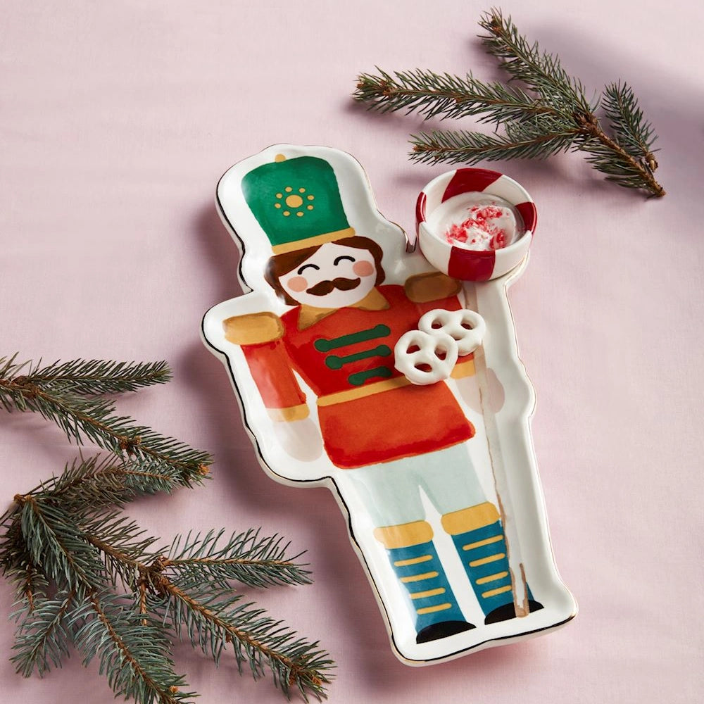 This charming ceramic serving piece features a classic nutcracker design with a built-in dip section, making it perfect for chips, veggies, crackers, and your favorite holiday dips.