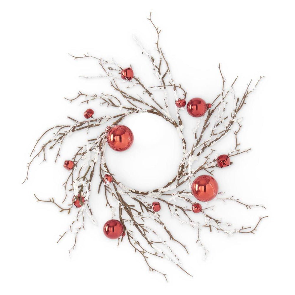 Red Ornaments & Bells Glittered Flocked White Candle Ring