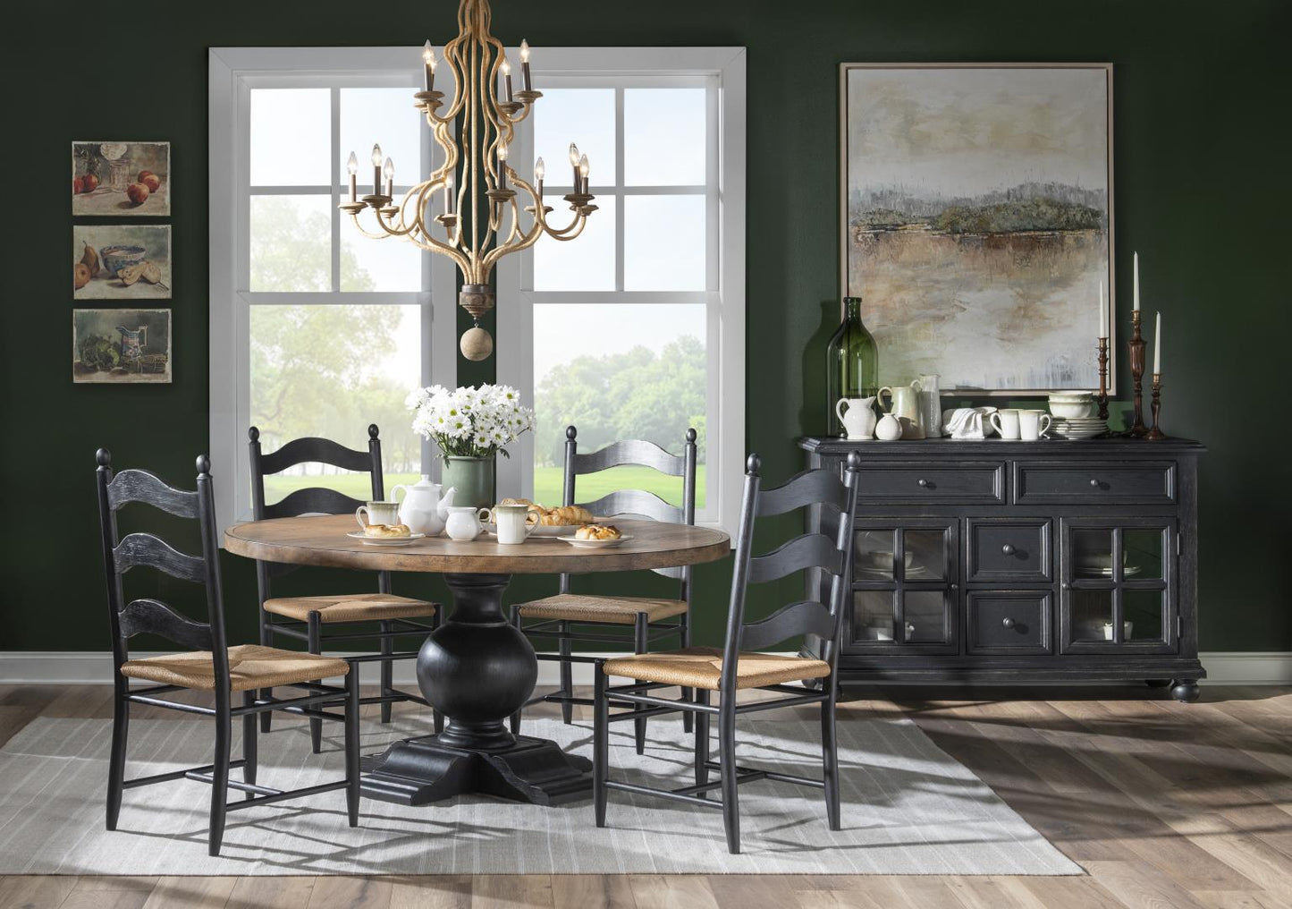 Bring timeless elegance to your dining space with this Rush Seat Ladder Back Side Chair. Handcrafted from select hardwoods and oak veneers, this Country Living piece features a distinctive kettle black finish that complements both traditional and transitional interiors. The classic ladder back design paired with a natural rush seat creates an inviting, authentic aesthetic perfect for farmhouse or cottage-inspired homes. A versatile seating solution that marries rustic charm with refined craftsmanship.
