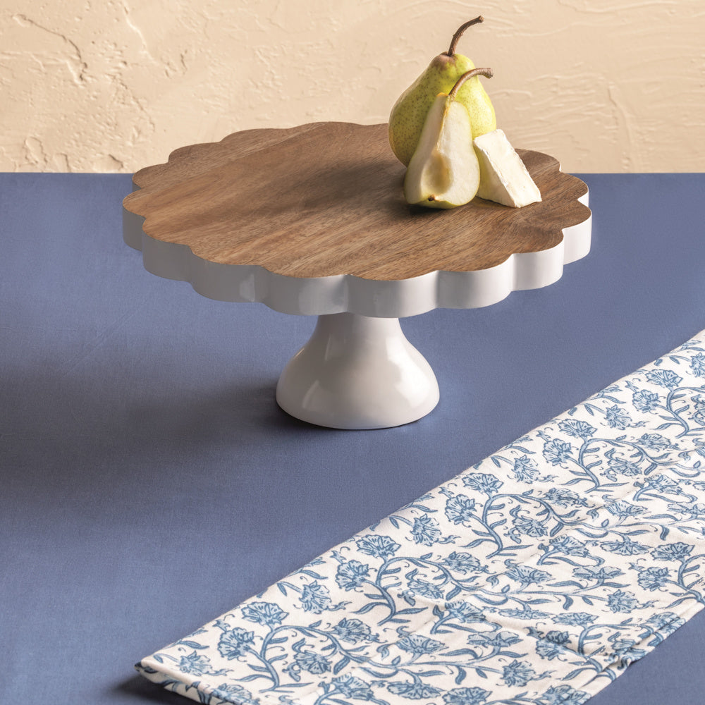 Mango wood pedestal server features hand-painted base and scallop edge.