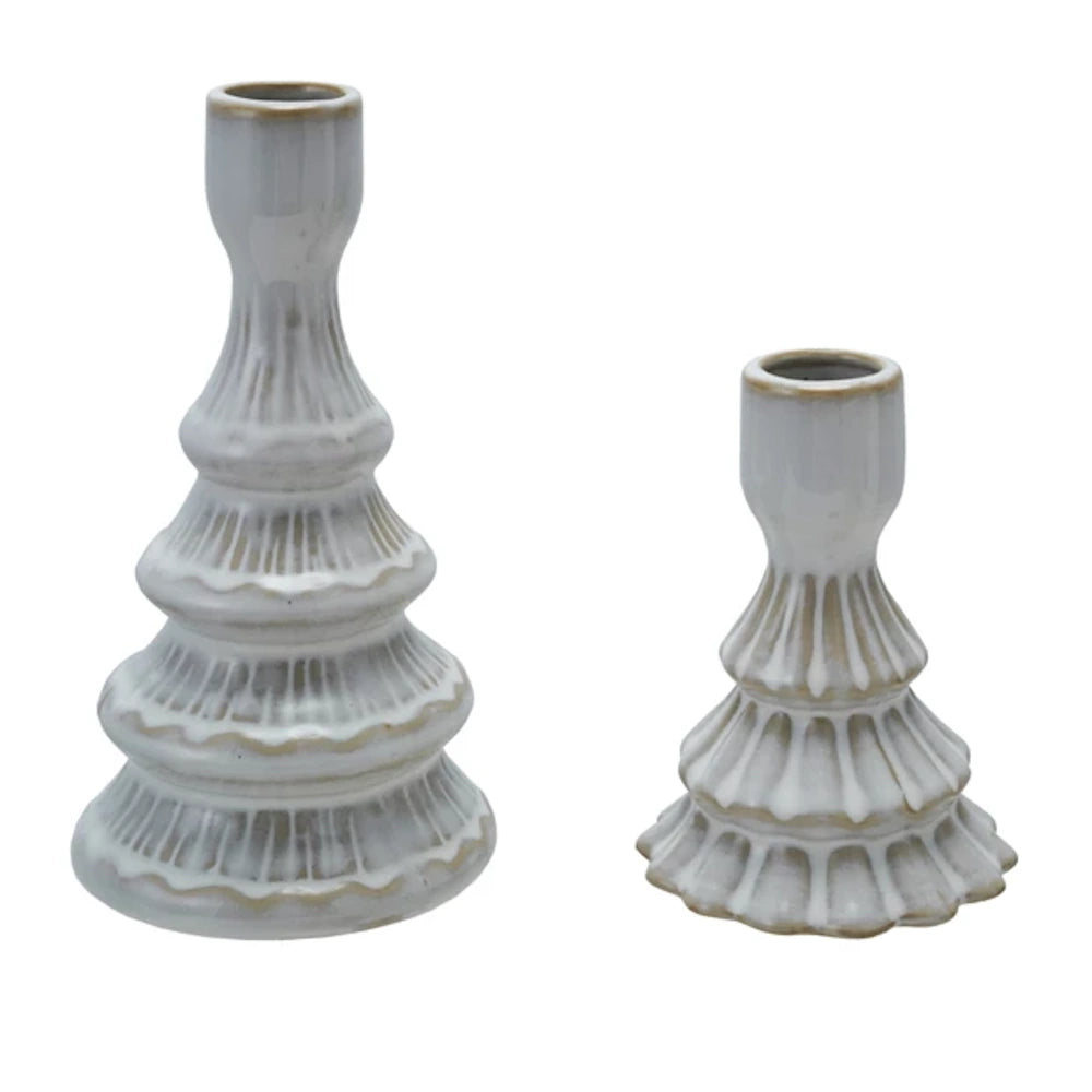 Set of 2 White Stoneware Tree Shaped Taper Holders