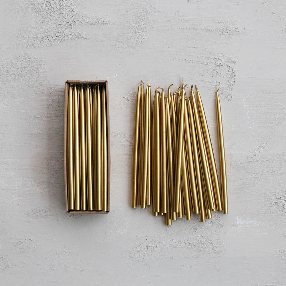 These elegant, slim candles feature a shimmering gold finish that adds sophistication and warmth to any setting.