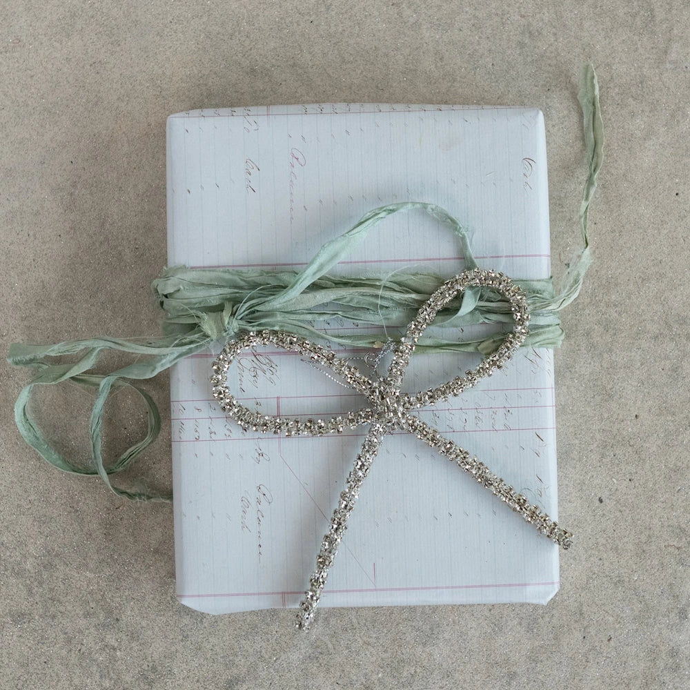 Crafted from durable metal and adorned with sparkling rhinestones, this elegant bow ornament brings glamour and sophistication to Christmas trees, wreaths, and garlands.