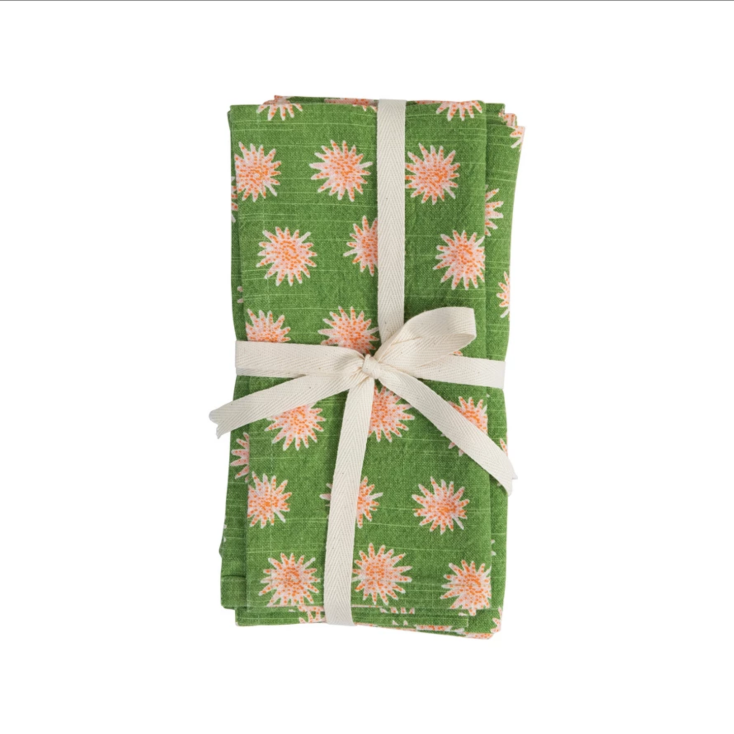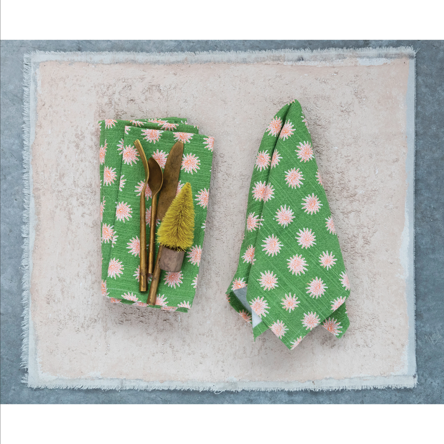 Square Cotton Slub Napkins with Pattern, Green, White and Pink, Set of 4
