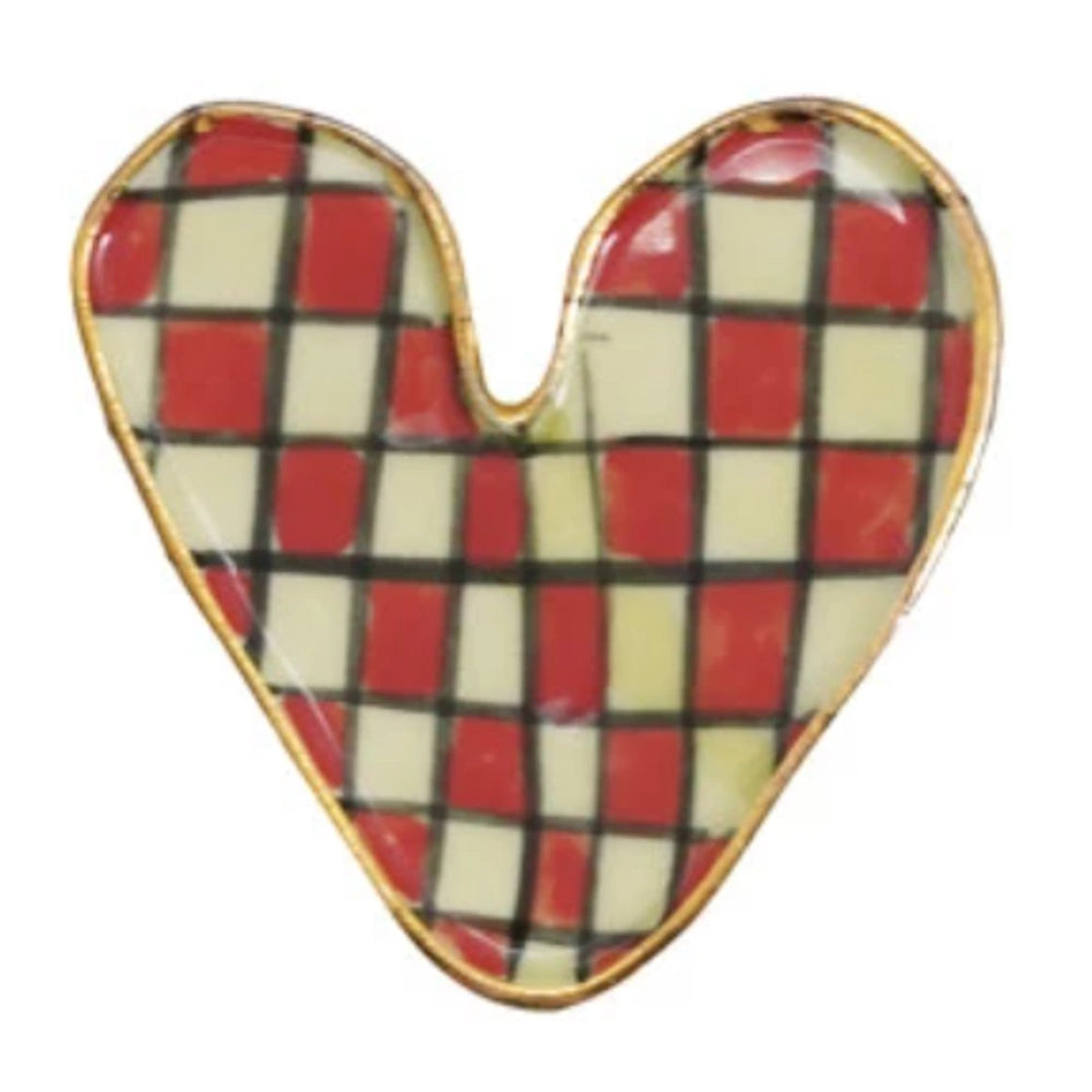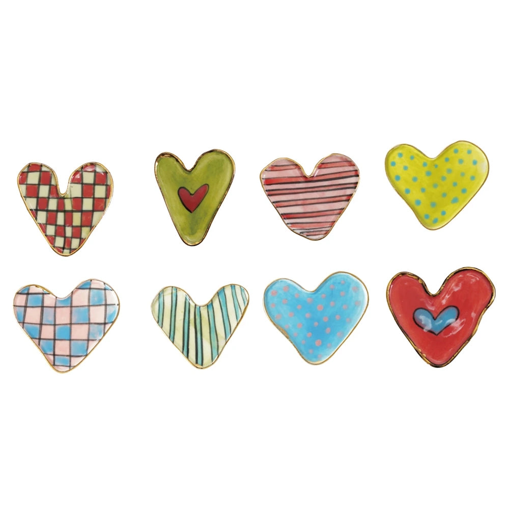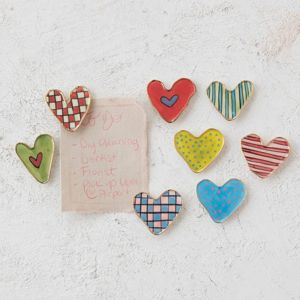 Add a sweet, artisanal touch to any space with this Hand-Painted Stoneware Heart-Shaped Magnet, beautifully designed in eight unique patterns. Finished with an elegant gold electroplated edge, each magnet brings warmth, whimsy, and personality to your fridge, office board, or gift wrapping.