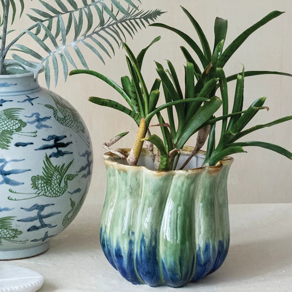 Shop the Stoneware Two-Tone Fluted Planter today at MISS DAISY'S Home & Decor and let your greenery shine.