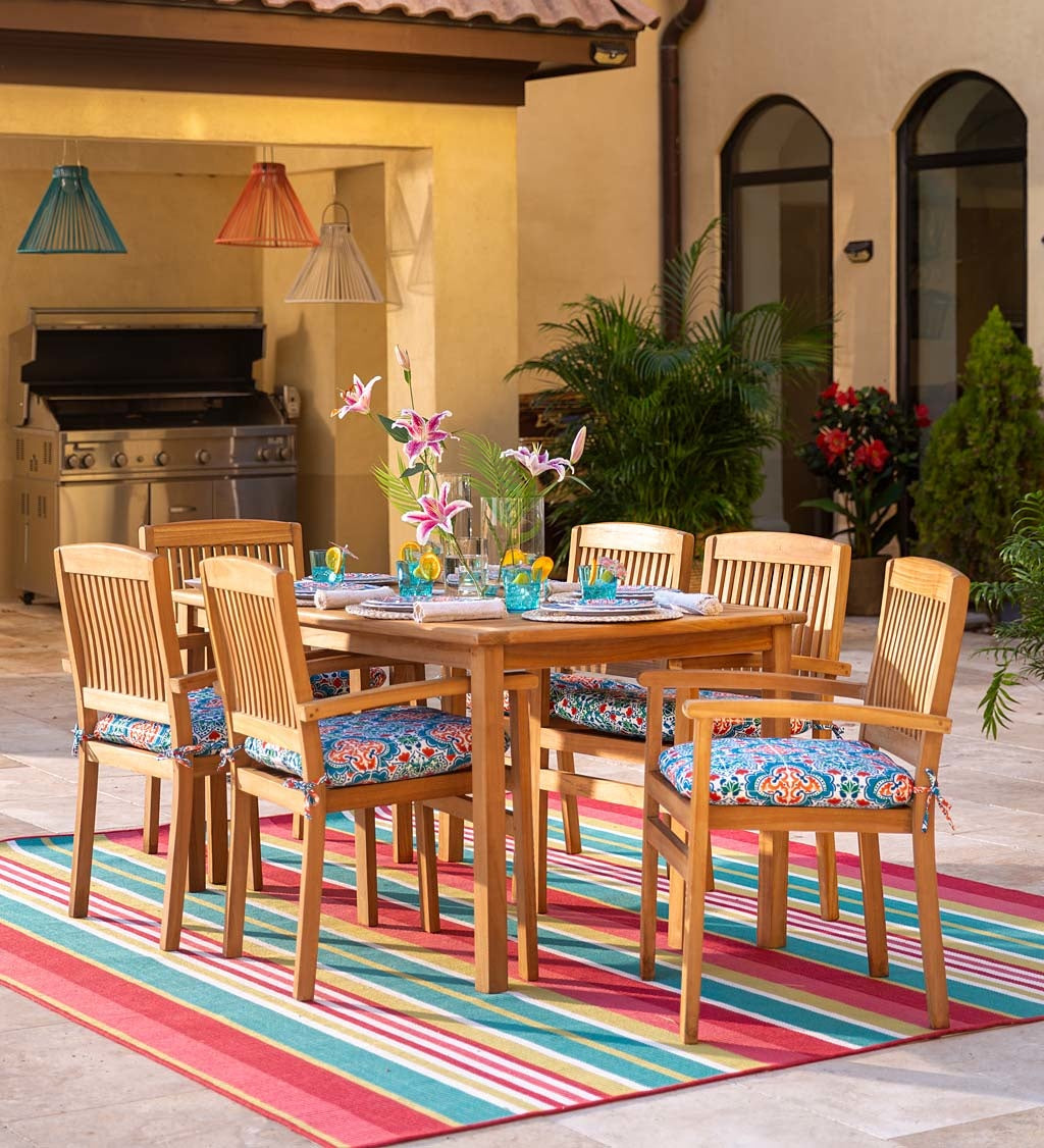 Each chair features a generous seat and comfortably arched arm rests. The slatted design allows for an attractive and effective way to prevent water from collecting on the seats. Comfortable enough to use with or without cushions. These chairs are a beautiful set made to bring you years of enjoyment.
