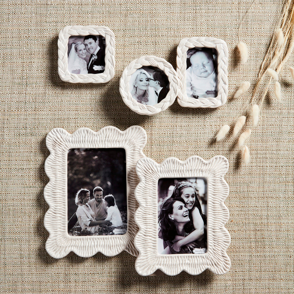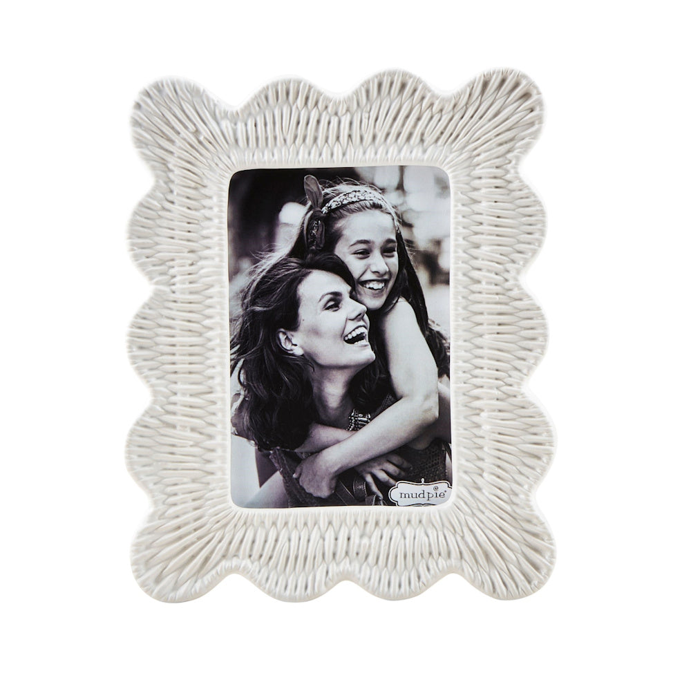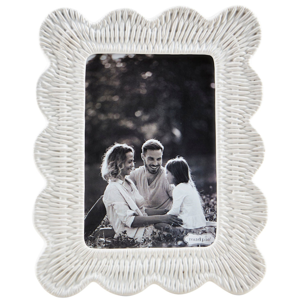 Stoneware frame with scallop edge and wicker texture.