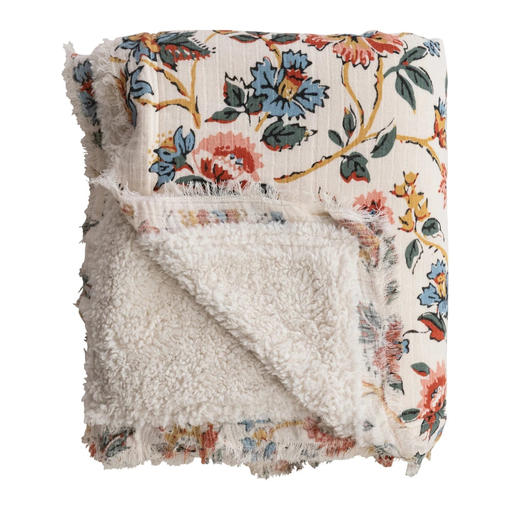 Wrap your home in comfort and charm with this beautifully designed cotton printed throw. Featuring a delightful floral motif, soft sherpa backing, and delicate fringe, it blends cozy functionality with effortless Creative Co-Op style. Drape it over your sofa, layer it on your bed, or keep it within reach for snug movie nights, this throw instantly elevates any space.