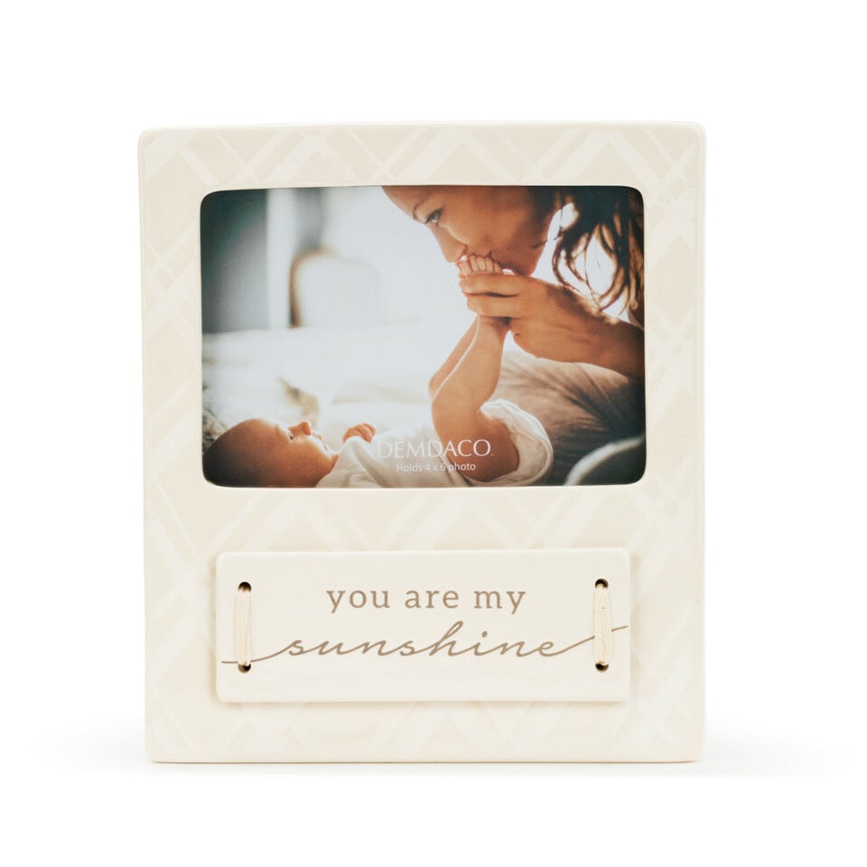 The beautiful You Are My Sunshine Frame is the perfect thoughtful gift for any new parent or parent-to-be on your list. This eye-catching classic photo frame features a timeless square shape with a subtle plaid print in neutral colors. Its versatile design allows for it to sit table top or be hung on the wall.